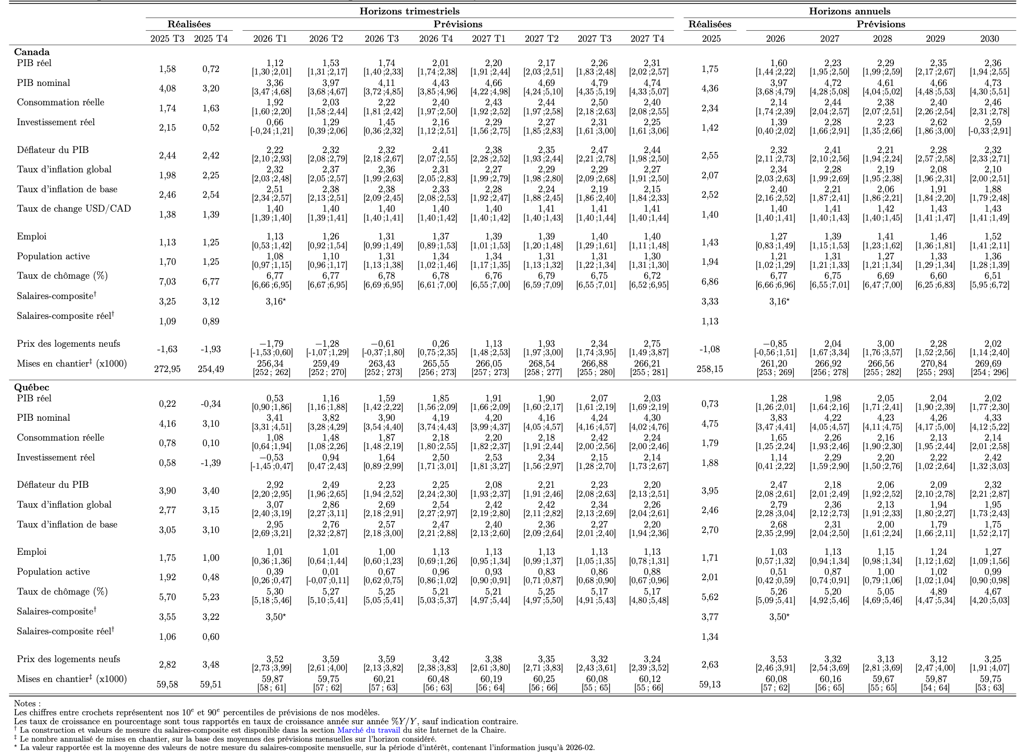 Il est important de souligner que la volatilité géopolitique récente, telle que le conflit au Moyen-Orient et ses répercussions sur l’énergie, ainsi que la révision de l’Accord de libre-échange entre le Canada, les États-Unis et le Mexique (ACEUM), ainsi que les récents développements en matière de politiques budgétaires, monétaires ou commerciales, pourraient entraîner des divergences entre les prévisions économiques et les résultats réels. Néanmoins, notre démarche méthodologique conserve l’avantage de bien capter l’élan actuel des économies canadienne et québécoise. Ainsi, nos prévisions doivent être comprises comme des scénarios de référence, établis en l’absence de nouveaux chocs susceptibles de perturber nos économies.